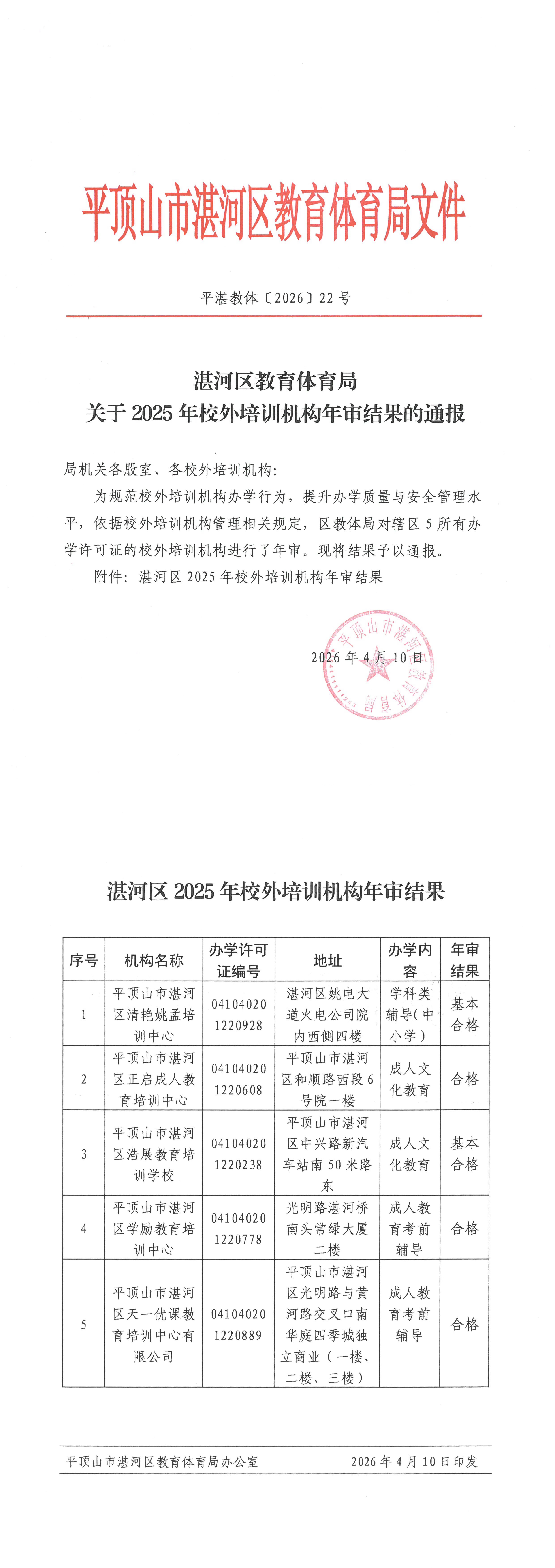 湛河区教育体育局关于2025年校外培训机构年审结果的通报