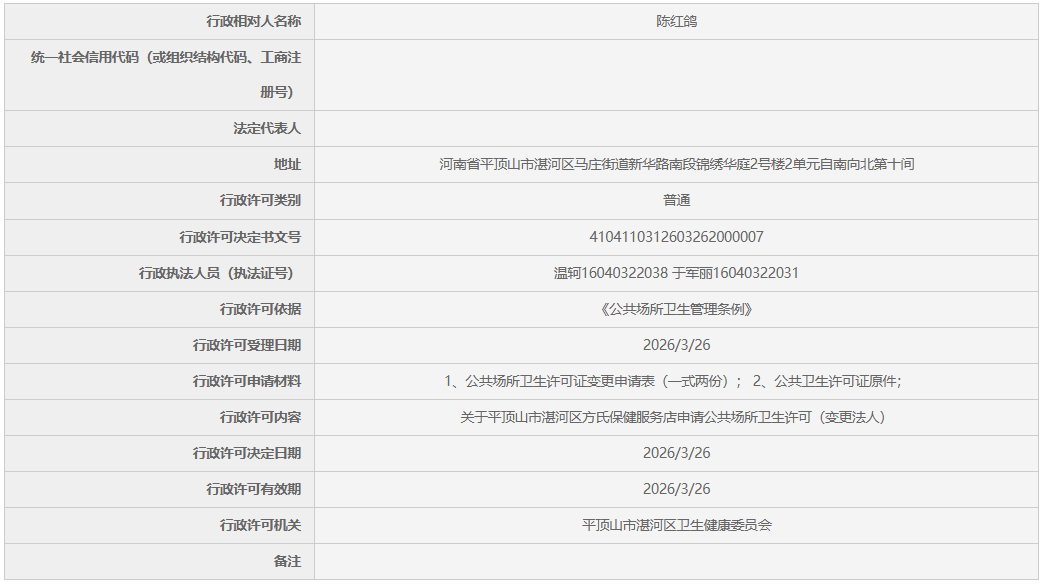 关于平顶山市湛河区方氏保健服务店申请公共场所卫生许可(变更法人)