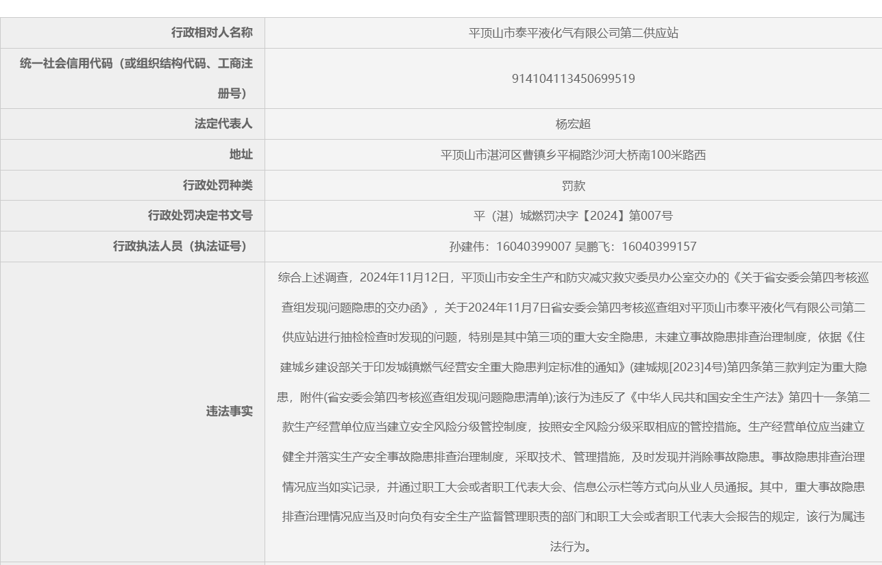 平顶山市泰平液化气有限公司第二供应站未建立事故隐患排查治理制度案